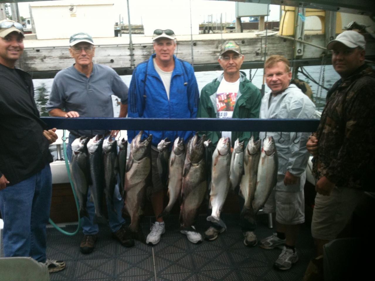 From this point on to the conclusion of the season, is probably the most misunderstood time of year with the most common question echoed, "is fishing good that time of year?" My answer is always, "it can be really good!" And in recent days it has been really good with hauls of 18, 16, & 13 fish earlier in the week in half-day trips and then 19 fish this morning. We continue to catch Kings of all sizes including the big spawning Kings as well as Steelhead and Coho.