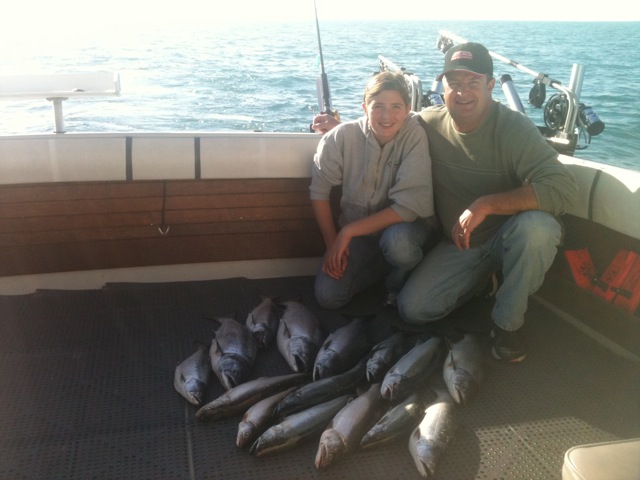 It was a fantastic finish to this year though as limit after limit of two and three-year old Kings were taken in offshore waters. Not only was the fishing awesome, we did it 'old-style' under beautiful skies and calm water with only four downriggers and only sometimes ran wire divers. We only ran leadcore and copper when I felt the bite was a touch slower and/or to give a chance at some stray steelhead. The size of our catch in both numbers and individual fish this fall - fish that will be mature four year-olds next season - suggests that 2012 King Salmon fishing may be one for the books. And while I look forward to that possibility, our Coho Salmon fishing this past season was one that people, Captains, will talk about for a long time. We had our usual limits in the Spring but this super strong Coho trend continued into June and we even caught huge numbers of Coho into July this year. When we thought that was about it, August and September arrived and there were days when our cooler had as many or more big Coho to go along with our Kings. By this point, these Coho typically weighed in at 8-10lbs and some larger Coho up to 14lbs were taken as well.