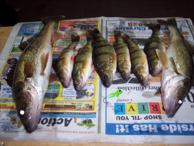 Went out today and moved my shack to what seems to be one of the better spots i have tried this season but things change , got set up around 3pm in 20 fow marked fish steady ended up getting 6 perch on wigglers on small pink and white 3-baller jig and 2 keeper walleyes 1 -16" and 1- 18 1/2" on walleye's choice double trouble jig Metallic green tipped with the head half of a 2" minnow also caught about 15 undersize walleyes.