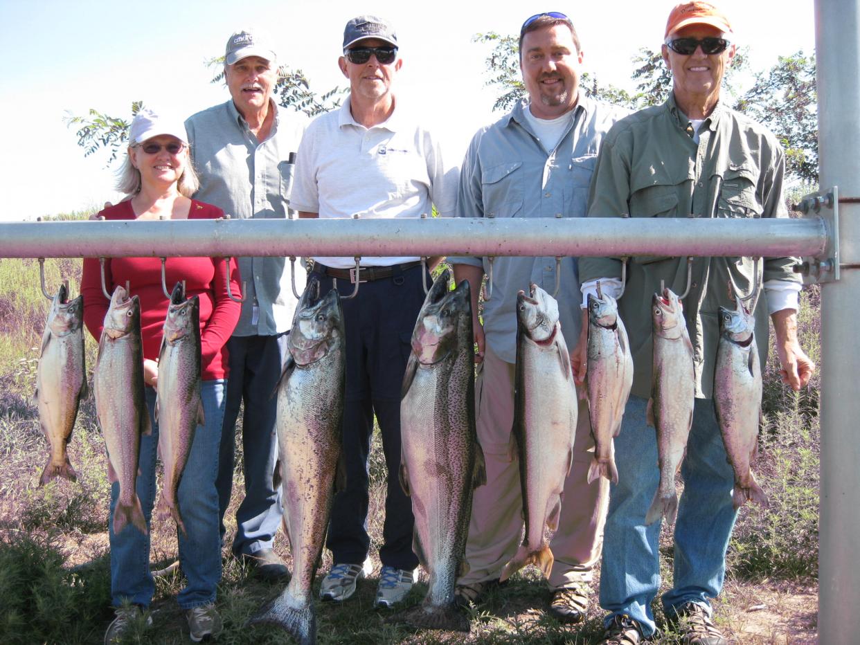 The waters have cooled and fishing has picked up with a nice mixed bag of mature Chinook, Lake Trout, Rainbow and some Coho. The fish are still out in 140 to 250 feet of water. Day by day and week by week they will start moving in and the best action will eventually be on the "hill". That said if you want to catch fish today you have to be willing to spend some money and fill up the tank. Best action is 75 to 100 feet down on large spoon and "O" dodger/fly combo. We're trolling a little faster than usual. Here is a sample of what you can expect.Attachment 17900