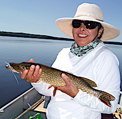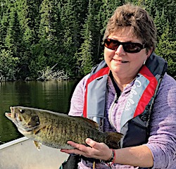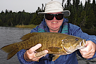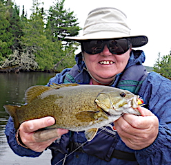 4th day these ladies enjoyed the weather, 72F sunny with a slight wind and caught both Northern Pike & Smallmouth Bass catching a total of a dozen in one bot on the silver & white Murdich Minnow. 5th day Judi & Natalie had a very good day catching both Northern Pike & Smallmouth Bass with Natalie catching her first ever Smallmouth, while Debra & Louisa portaged to another lake having a blast catching many Smallmouth Bass. All had a super time and expressed how wonderful the total experience they had with us at Fireside Lodge. All hope to return in 2 years.