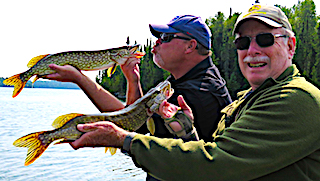 Bill Aulenbach from Barberton, OH at age 85 returned for his 13th trip with us at Fireside Lodge, coming with his son Michael from Ft Meyers, FL for his 5th visit. 1st day out was great as Bill had 11 Northern Pike landing all seven all on a lure he purchased from my tackle shop using a stop and go / pause retrieve. As soon as Mike switched over to the same lure, Bill purchased two, he started catching fish. 2nd day was a slower day but they did catch some Pike and enjoyed just being together catching up on their lives in the wilderness surroundings. 3rd day was a rest day for Bill and Mike. Bill got too much sun the first two days and needed a break from the sun and since it was going to be a clear day they thought it best not to push the situation. After supper they went fishing and Bill had a big fish bite him off above his 9-inch leader. 4th day they spent chasing Muskie, which they never caught up to one but had fun trying. 5th and final day was very good as they searched out some new areas catching many Northern Pike. They also changed their tactics fishing different depths and types of structure, which worked well. For these two it has never been just about the fish but more about spending time together making father and son memories at a place they enjoy. Before departing they were already planning next years return.