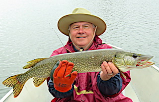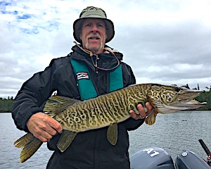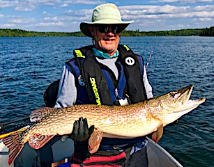 Bob & Jane Babcock from Midland MI arrived for their 21st consecutive year fishing with us at Fireside Lodge. 1st day out was very good catching some Northern Pike and seeing what they were looking for, some very large fish, Muskie and Pike, following their lures. Jane did best using what she called her secret lure, which was a spinner bait type lure with a pink silicone skirt dressed with a pink twister tail which did not last long. The twister tail in pink is hard to find and not having any in my tackle shop Jane had to revert to orange. 2nd day was slower, having some big follows and catching some medium size Pike. 3rd day was a miserable cold front day with rain a wind but they toughed it out all day with good results catching some nice Northern Pike. 4th day was day after the cold front and they fished a new area getting very good results seeing and catching some nice fish and Bob caught a beauty, an extremely heavy, 35-inch Tiger Muskie. 5th and final day they had a very good numbers day catching many Northern Pike all day long. They left having another great trip with us at Fireside Lodge and as Bob said it’s been “21-years of good fishing, great fun, and meeting lots of Great people”.