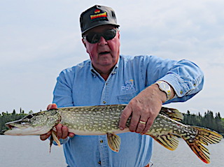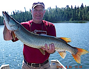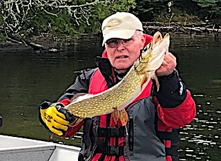 Bob & Jane Babcock from Midland MI arrived for their 21st consecutive year fishing with us at Fireside Lodge. 1st day out was very good catching some Northern Pike and seeing what they were looking for, some very large fish, Muskie and Pike, following their lures. Jane did best using what she called her secret lure, which was a spinner bait type lure with a pink silicone skirt dressed with a pink twister tail which did not last long. The twister tail in pink is hard to find and not having any in my tackle shop Jane had to revert to orange. 2nd day was slower, having some big follows and catching some medium size Pike. 3rd day was a miserable cold front day with rain a wind but they toughed it out all day with good results catching some nice Northern Pike. 4th day was day after the cold front and they fished a new area getting very good results seeing and catching some nice fish and Bob caught a beauty, an extremely heavy, 35-inch Tiger Muskie. 5th and final day they had a very good numbers day catching many Northern Pike all day long. They left having another great trip with us at Fireside Lodge and as Bob said it’s been “21-years of good fishing, great fun, and meeting lots of Great people”.