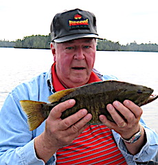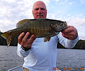 Long time return guests Joe and Marilyn Foos from Alpharetta, GA were glad to be back in the Northern Wilderness chasing Smallmouth Bass. 1st day was windy making it a challenge to surface fish but they caught 10 nice Smallmouth by the end of the day. 2nd day was better catching more but they still were not aggressive on the surface. 3rd day was a charm as they did excellent in the morning until about 1pm catching many BIG Smallmouth all on surface lures, Joe using a Wake Bait and Marilynn using her favorite Torpedo. 4th day was another fabulous day catching many Big Smallmouth all on the Wake Bait and Joe caught a Giant 19.5 inch Smallmouth Bass that he said had to weigh at least 5lbs, and Marilynn was all smiles in the dinning room at supper time saying the fishing action was great. 5th day was more of the same with both catching a lot of Smallmouth Bass, but Joie still had the hot hand with the BIG Smallmouth landing another 19-inch plus fish. Joe said it is attributed to his long precise casts and in Marilynn’s opinion it was luck, but I took the middle ground position saying it was a little of both.