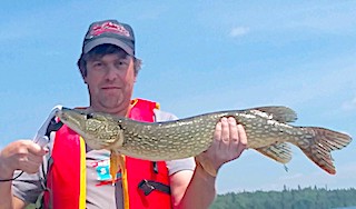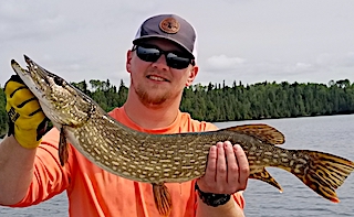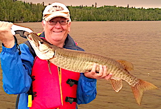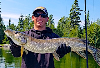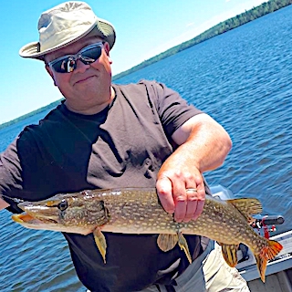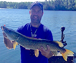 Ray Canady from Waycross, GA was thrilled to be returning to Fireside Lodge with his son Jonathan from Savannah, GA. 1st day of fishing was great catching 20+ Smallmouth Bass and 10 Northern Pike and the color of the day was pink as they came to my tackle shop on a search and resupply mission. 2nd day they had a great day catching 30+ Smallmouth Bass, 20+ Northern Pike and they sighted a HUGE Northern Pike swimming by their boat, so Jonathan threw an in line spinner away and ahead of the fishes direction, bringing it back on an angle and the fish just slammed it. It jumped clear out of the water and the fight was on right up to the boat but just before netting the fish it shook the hook. They both estimated the Northern Pike to be at least 40-inches.