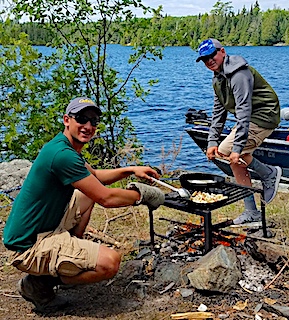 3rd day they had a good day catching a mix of fish and enjoying the good weather. 4th day the highlight was shore lunch and all the activities that go with it and both Sean and Christian got very involved with cooking. 5th day we discussed fishing location and presentation for Smallmouth Bass and these three knocked it out of the park catching 35+ Smallmouth Bass with their newly learned technique. 6th and final day was a super finish continuing where they left off the day before catching well over 50 Smallmouth Bass and Sean caught the largest Northern Pike of his life while Smallmouth fishing landing a big fat 36 inch Pike. Joe left very happy knowing that he had a very successful fishing Adventure with his grandsons saying that this was an important item on his bucket list. All left with memories to keep giving for years to come.