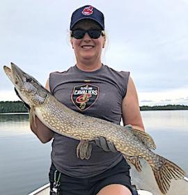 Fran and Colleen Stack from Lorain, OH returned for their 14th time. DOA they went right out and caught 14 nice Smallmouth Bass, several Northern Pike plus Fran landed a 33-inch Muskie and a 19-inch walleye. What a start catching 4 species in just a few hours of fishing. 1st full day they caught a lot of Smallmouth Bass, with a lot on the bigger side, and Colleen caught a beauty 18.5-inch Trophy Smallmouth Bass. They also caught some nice size Northern Pike. 2nd day was adventure fishing travelling through a creek, breaking down a beaver dam to make it through to one of our back lakes. They had an absolute blast catching 79 fish, mostly Northern Pike and a few Smallmouth Bass.