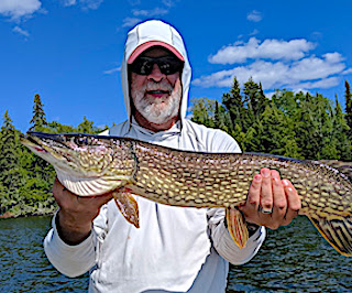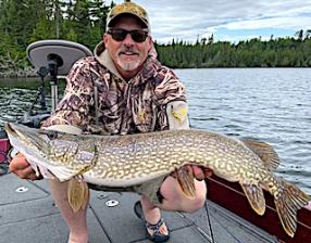 Jim Rienbold was visiting us at Fireside Lodge for his first time taking him down memory lane. 40 years ago he visited the Sioux Lookout area with his grandparents making many long lasting memories as a youngster. He started soaking everything up from the minute he arrived and had some very exciting action within the first few hours of the first day, catching some BIG Smallmouth Bass and had several BIG toothy critters come up and steal two of the lures he purchased from me that morning. Realizing his line needed replacing he came back to re-supply so he could continue on with his day, which he did catching more fish. 2nd day Jim said was fabulous catching many Northern Pike keeping a solo angler very busy. 3rd day was fabulous and ended just perfect for Jim, as stated by him, finding new areas of the lake catching Northern Pike and two Walleye of which he was wanting to catch to round off his trip. Jim arrived and departed with emotion saying this trip did him a world of good and plans on visiting us at Fireside Lodge on a regular basis.