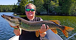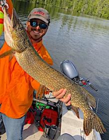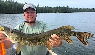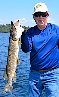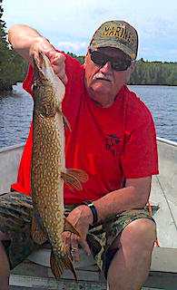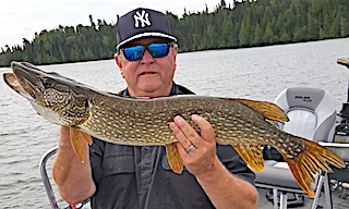 The Ramsey Brothers Mike alias Boomer from Penn Valley, CA, Don alias Blooper or Ned from Hillsboro, OH and Dan alias Bob from Germantown, OH returned for their annual fishing trip with us at Fireside Lodge. 1st day they did well catching a mix of Northern pike and Smallmouth Bass. The second day they were on fire catching 131 Northern Pike and several nice Smallmouth Bass including a Monster Trophy Fish by Dan measuring 20.5-inches. After supper searching for some BIG fish Dan found one landing an enormous 40-inch Northern Pike with a head bigger than Dan’s.