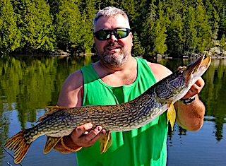 4th day was excellent as Gary, Josh, and Pete caught a lot of mid size Northern Pike saying they were really on especially after supper, plus they saw several big fish. So a side story was while Josh was rolling up his pant legs, holding his rod by sitting on the handle, all of a sudden there was a big splash by his lure that was just dangling in the water and then the Rod took off. Just grabbing it before it went in the lake a 28-inch Northern Pike ended up being the culprit. 5th day was a real good day catching many Northern Pike and Steve was on fire catching up after a few days of not feeling well.