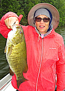 2nd day was almost a repeat of day 1 with out the Muskie escape incident. 3rd day Larry and Rich managed to catch 25+ nice Smallmouth Bass despite a typical Canadian cold front with high winds from the north and on and off rain spurts. Ed and JoAnn also faired well for conditions and JoAnn caught her second Master Anglers Award Smallmouth Bass at18.5-inches. 4th day had Ed and JoAnn catching 18 Smallmouth Bass while Rich and Larry caught 26 Smallies. 5th day all had a great day Smallmouth Bass fishing with Rich and Larry ending up with 32 Rich having 2 trophies over 18-inches plus Larry had the largest Trophy Smallmouth Bass measuring 19-inches along with them catching some 15,16, and 17-inch plus fish.