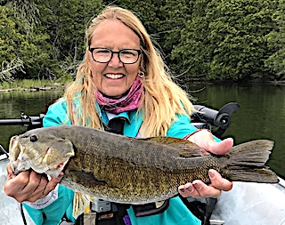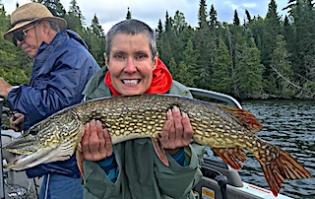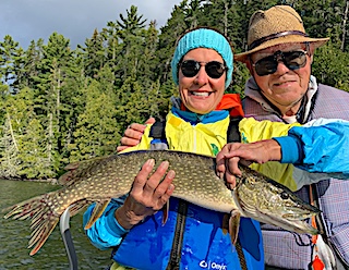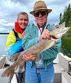 Long time guests Joe and Marilyn Foos from Apharetta, GA were glad to be back searching out those big trophy Smallmouth Bass. Day of arrival they did well catching some very large Smallmouth Bass. Marilynn said it was Joe that had the hot hand at the beginning of the day and she had some catching up to do. 1st day was very good with Joe starting out very strong catching most of the fish but by mid-day Marilynn made a big comeback catching her fair share of the larger Smallmouth Bass. Second day started out in the early morning before breakfast catching some nice Smallmouth on the surface, and for the balance of the day Marilynn had a strong day inching her was closer to catching up with Joe. They love the Smallmouth Bass fishing concentrating their efforts targeting them with mostly surface techniques catching some of the largest Bass this way. 3rd day they had waves of activity amounting to another good day. 4th day started with heavy rains but then by noon things shaped up weather wise and they had a good day catching Smallmouth Bass and a few of those Pike that tend to steal their good Smallmouth Bass lures.