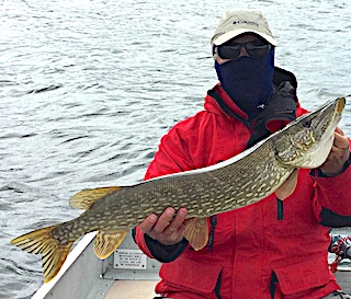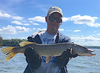 Al Fishhaber from Northfield, OH and Rob Delamatre from Sandusky, OH have been fishing with us at Fireside Lodge for over 25-years. These two had a great day catching Northern Pike, only a few fish in each spot, but by having knowledge of fishing Little Vermilion Lake for many years and moving a lot enabled them to catch many fish. 2nd day was very good fishing but Rob had a special pre storm happening. This was a text book catch as thunder was being heard far away in the background the fishing was really active and then Rob tied into a HUGE FAT 42-inch Muskie landing it after a spectacular fight. After all the activity of a big catch calmed down they realized that the approaching storm was getting closer and called it a day getting back in time to watch the T-Storms undercover at the Lodge. 3rd day had them catching many average to medium size Northern Pike.