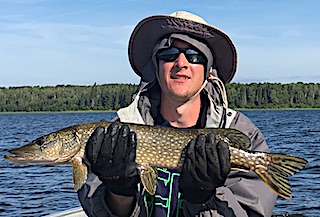 Dave Henry with son Jacob from St Charles, and Bloomington, IL with brother-in-law Bob Mezo from Dixon, Il were back for their 9th time, and joining them for the first time was friend John Lindsey from Atlanta, GA. DOA they targeted Muskie and ended up catching 4 and had many follows. 1st day was super fishing for Northern Pike catching most fish between 26 to 31-inches all being very hefty, and by the end of the day their total group catch was 76 Northern Pike and several Smallmouth Bass, plus Dave landed a HUGE Trophy Smallmouth Bass measuring 19-inches.