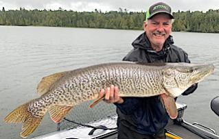 Bob & Jane Babcock from Midland MI arrived for their 22nd consecutive year fishing with us at Fireside Lodge. 1st day was a very windy rainy day with classic cold front conditions but they managed to catch some Northern Pike with Bob coming up with a BIG FAT 37-inch Northern Pike. 2nd day Bob continued his success catching Northern Pike on a Blue Fox spinner with a purple pink blade and a purple bell. He has a terrific assortment of specialty lures for big Musky and Northern Pike but every time he throws this spinner he catches fish. 3rd day Bob kept his streak going catching Northern Pike 30-34.5-inches, again using his special lure. Jane also caught fish but missed a HUGE Muskie while using a favorite Spoon of hers made by Sebile. 4th day Bob had another good day catching a number of 30-inch plus Northern Pike, Largest 35-inches plus he landed a 37.5- inch Tiger Muskie.