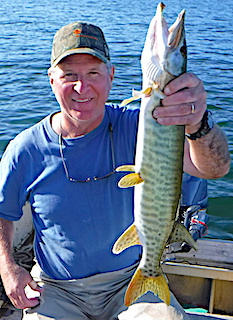 2nd day was severe cold front conditions, with heavy winds and on again off again rain all day long so they decided to target Muskie since bad weather usually gets them moving, according to the magazines. Well it proved correct today with Matt catching his second 36-inch Muskie for the trip and a 33 inch fat Pike, plus they had well over 30 Follows and 5 or six strike their lures and come off after a quick confrontation. Also some were right behind their lures bumping and surging towards them. Bill also caught a Muskie on what he called a figure 16 as that’s the number of figure eight rotations he did before the fish hit his lure. All and all it was a very productive day Muskie fishing, full of excitement and fun. 3rd day similar conditions prevailed but started to show signs of relief with the sun peaking out at about 3PM, however the winds were persistently strong and temps were colder. Matt and Bill fished all day long and into the evening catching 20 Northern Pike up to 34 inches and had several Muskie follows.
