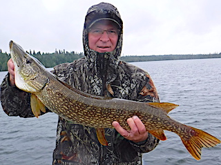 Wade Keiss and David Goacher from Mount Prospect and Libertyville, IL returned for their 4th time to chase Toothy Critters. Day of arrival they caught some northern pike before supper. 1st full day they did well on this very windy day catching 16 northern pike, some in the 30 to 34 inch range with the biggest measuring 35-inches. 2nd day was another good day catching 17 Northern Pike and Wade caught an 18.5-inch Master Anglers Award Smallmouth Bass. This happened after a slow period and Wade decided to use a lure he never used before which was an elongated double prop bait. According to David it was very ugly and said it was not qualified to be a lure. But on Wades first cast with this lure a huge 18.5-inch Trophy Smallmouth Bass attacked it leaping clear out of the water. Great Story and Great catch by Wade. 3rd day was severe cold front conditions with high winds and rain all day long, however despite difficulty positioning their boat and unable to fish certain areas they still caught 20 nice Northern Pike.