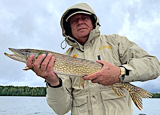 Bob & Jane Babcock from Midland MI arrived for their 22nd consecutive year fishing with us at Fireside Lodge. 1st day was a very windy rainy day with classic cold front conditions but they managed to catch some Northern Pike with Bob coming up with a BIG FAT 37-inch Northern Pike. 2nd day Bob continued his success catching Northern Pike on a Blue Fox spinner with a purple pink blade and a purple bell. He has a terrific assortment of specialty lures for big Musky and Northern Pike but every time he throws this spinner he catches fish. 3rd day Bob kept his streak going catching Northern Pike 30-34.5-inches, again using his special lure. Jane also caught fish but missed a HUGE Muskie while using a favorite Spoon of hers made by Sebile. 4th day Bob had another good day catching a number of 30-inch plus Northern Pike, Largest 35-inches plus he landed a 37.5- inch Tiger Muskie.