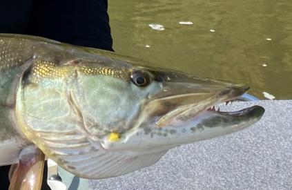 We put a low-40’s in the net yesterday and had another hot fish slash at boatside all before 11am. The rest of the day got very slow for us after the sun got bright. As soon as we looked in the net, we noticed the bright yellow spot on her cheek. I do not remember ever seeing any yellow on any previous Allegheny muskies.